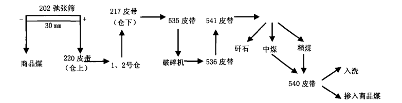 原設計流程采用30-80mm風選後,精煤落地作爲動力煤銷售,由于井下煤質不斷變化,在煤質較差時,商品煤發熱量較低,通過設計540轉載皮帶,将風選後的精煤與商品煤混合,提高商品煤質量。另外,風選精煤經過簡單排矸後,也可通過540皮帶轉載進入重介系統,提高重介洗選精煤回收率。