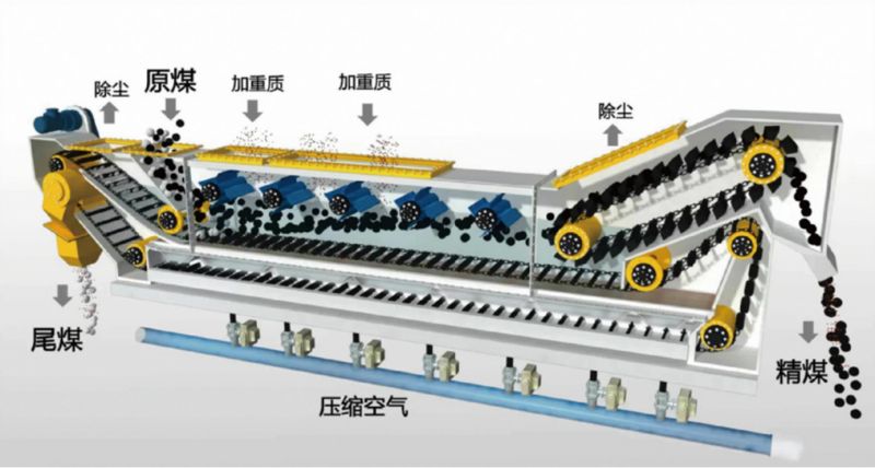 分選原理 : 細粒固體加重質在經均勻布風後的上升氣流的作用下,形成具有似流體特性的氣一固兩相流,入選物料在氣一固兩相流床層中按照床層密度分層,小幹床層密度的物料上浮,大于床層密度的物料下沉,分層後的輕重産物分别通過撥煤輪和刮闆輸送機構排出。